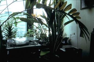 Kolibrinkukka (Strelizia reginae, Strelitziceae) kukkii kodin olohuoneessa. Yleensä sen saa ostaa kukkakaupasta - tässä se kasvaa kukkaruukussa. Matkamuisto-siemenpussi ostettu Kanarian saarilta 1987. Palmun lehti kuvan etualalla lähtee suuresta palmusta, joka on saatu kasvamaan siemenestä, joka otettiin puusta Holiday Inn -hotellin pihalla San Juanissa, Puerto Ricossa Karibianmerellä 1971. [ID=10883/tls033k.jpg] |