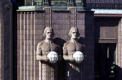 Lyhdynkantajat Helsingin rautatieaseman Kaivokadun puoleisella seinustalla. Arkkitehti Eliel Saarinen sijoitti kaksi harmaasta, graniitista veistettyä jykevää mieshahmoa valaisimien kannattajiksi rautatieaseman pääsisäänkäynnin molemmille puolille. [ID=13855/bol5067m.jpg] |