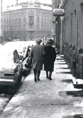 Kaksi naista kävelemässä käsikynkkää lumisella Laivurinkadulla kohti Viiskulmaa. [ID=1565/322633.jpg] |