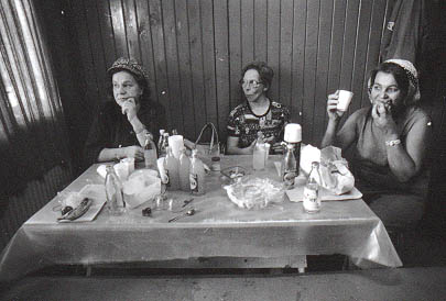 Naisia syömässä eväitä ruokatunnilla rakennustyömaan parakissa Itä-Pasilassa. [ID=1581/304122.jpg] |
