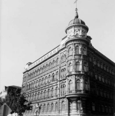 Pohjoisrannan ja Kirkkokadun kulma. Kuvaajaa lienee kiehtonut rakennuksen majesteetillisuus ja massiivisuus, jonka koristeet luovat toiselle puolelle dramaattiset varjot.