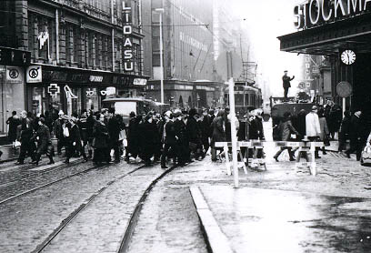 Jalankulkijoita ylittämässä Aleksanterinkatua tammikuussa joulukoristeiden purkamisen aikaan Stockmannin tavaratalon edustalla. [ID=1734/110322.jpg] |