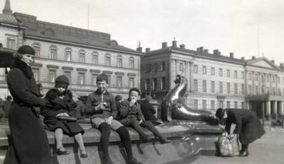 Sirkka ja Unto Havis Amandan patsaalla Kauppatorilla.