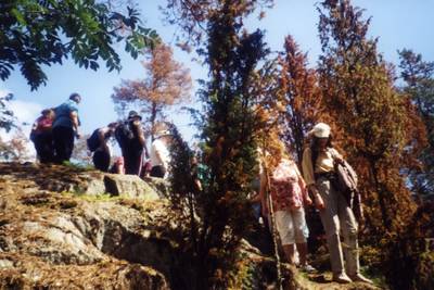 Luontoretkellä. Kuivuus muutti puut ruskeaksi jo heinäkuussa.