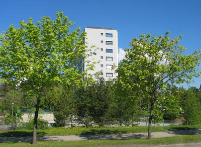 Kesä tekee tuloaan Kontulaan. Näkymä Kontulantieltä bussi 94B:n ikkunasta. Keskellä Kotikonnuntie 2:n pääty. Talon julkisivu- ja parvekeremontti on valmistumisvaiheessa.