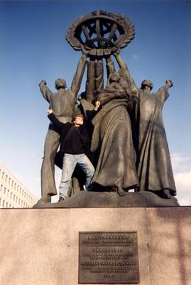 Nuori osakuntalainen on noussut Mailmanrauha-patsaan jalustalle matkien irvokkaasti taideteoksen hahmoja. Hakaniemenrantaan sijoitettu patsas on Moskovan lahja Helsingin kaupungille, mutta varsinkin yliopistonuorison keskuudessa teos on alusta asti herättänyt närkästystä. Patsaan takana näkyy Opetusviraston julkisivua. [ID=21533/pran010m.jpg] |