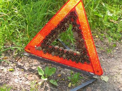 Kävyillä koristettu varoituskolmio polun reunassa varoittaa Käpylehmästä Kivinokan ympäristötaidenäyttelyssä. [ID=22249/153_5324.JPG] |