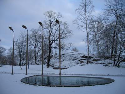 Urho Kekkosen muistomerkki Lähde talvisessa puistossa. Muistomerkin on suunnitellut Pekka Jylhä. [ID=24869/214_1414.JPG] |