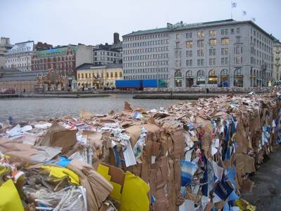 Märkä jätepahvimuuri reunusti Kauppatoria sunnuntaisen vedenpaisumuksen jäljiltä vielä maanantai-iltapäivällä. Taustalla Etelärannan taloja. [ID=24993/222_2281.JPG] |