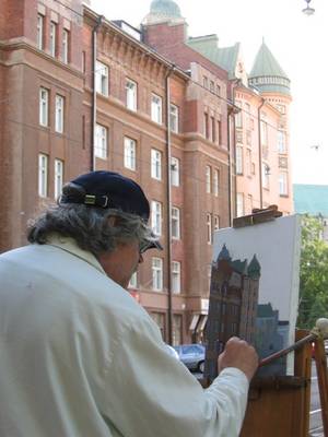 Taiteilija keskittyneenä työhönsä kauniina kesäpäivänä Karhupuiston kupeessa. [ID=27178/274_7467.JPG] |