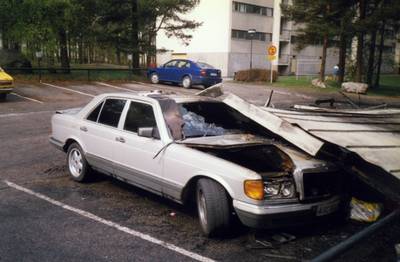 Mercedes-Benz 280 tuhoutui roskakatoksen palaessa perusteellisen pahoin.