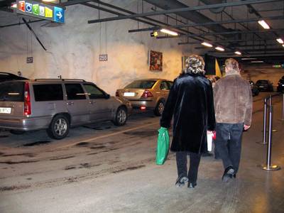 Parkkihalli, josta kulkuyhteydet Forumiin ja Stockmannin tavarataloon.