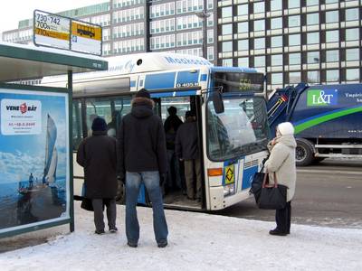 Maakaasubussi 55A pysäkillään Hakaniementorin laidalla. Bussikatoksessa mainos venemessuista. [ID=31014/teko576m.jpg] |
