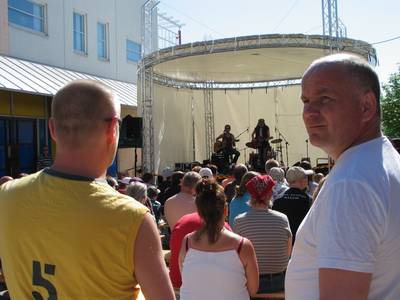 Ensimmäisiä Kontulan OstariFestareita suosi helteinen kesäsää. Lavalla yleisöä viihdyttää Pelle Miljoona.